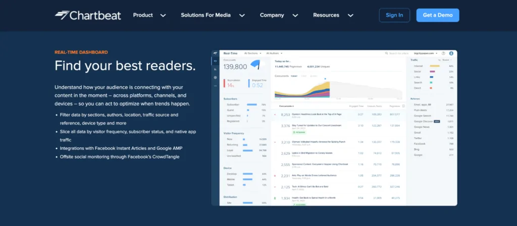 Chartbeat is a real-time analytics platform publishers and content creators use to track how audiences interact with content. It’s known for providing insights on reader engagement and helping website owners optimize their articles.