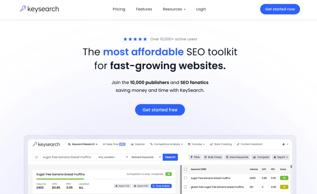 | KeySearch | Keyword difficulty and search volume, competitor keyword analysis, backlink profiles, rank tracking for targeted keywords, YouTube keyword opportunities | $24 per month or $240 per year |